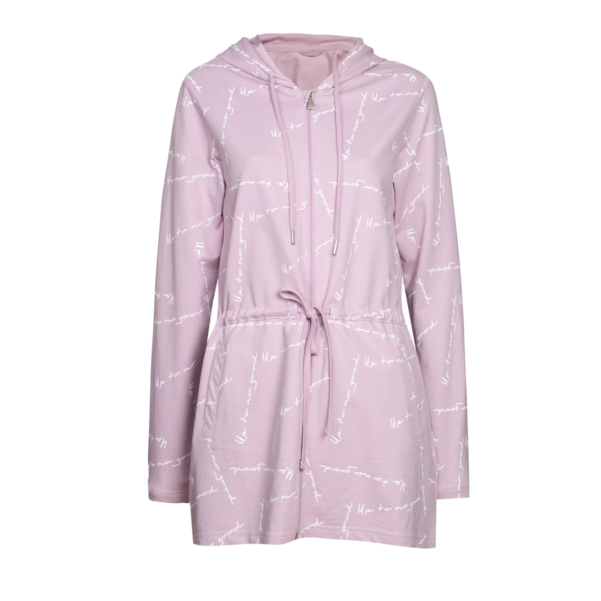 Ez a női hosszú ujjú pulóver kapucnival és húzózsinóros derékkal rendelkezik, amellyel a fazont a hangulatodtól függően szűkebbre vagy lazábbra állíthatod. A puha, 100% pamut anyag kényelmes viseletet biztosít a bőrön, míg a sportos megjelenést finom részletek egészítik ki.